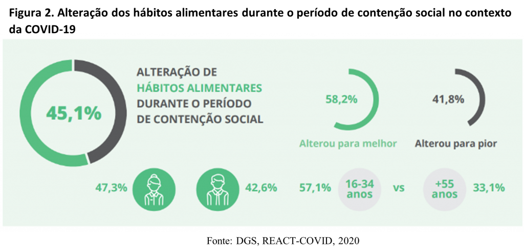 Devido ao contexto atual, inerente à COVD-19, a Direção-Geral de Saúde conduziu um estudo entre com o objetivo de conhecer os comportamentos alimentares e de atividade física dos portugueses em contexto de contenção social. Os resultados indicam que cerca de 45,1% da população inquirida assume ter efetuado alterações de hábitos alimentares durante o período de contenção social sendo que 41,8% alterou os seus hábitos para pior.3