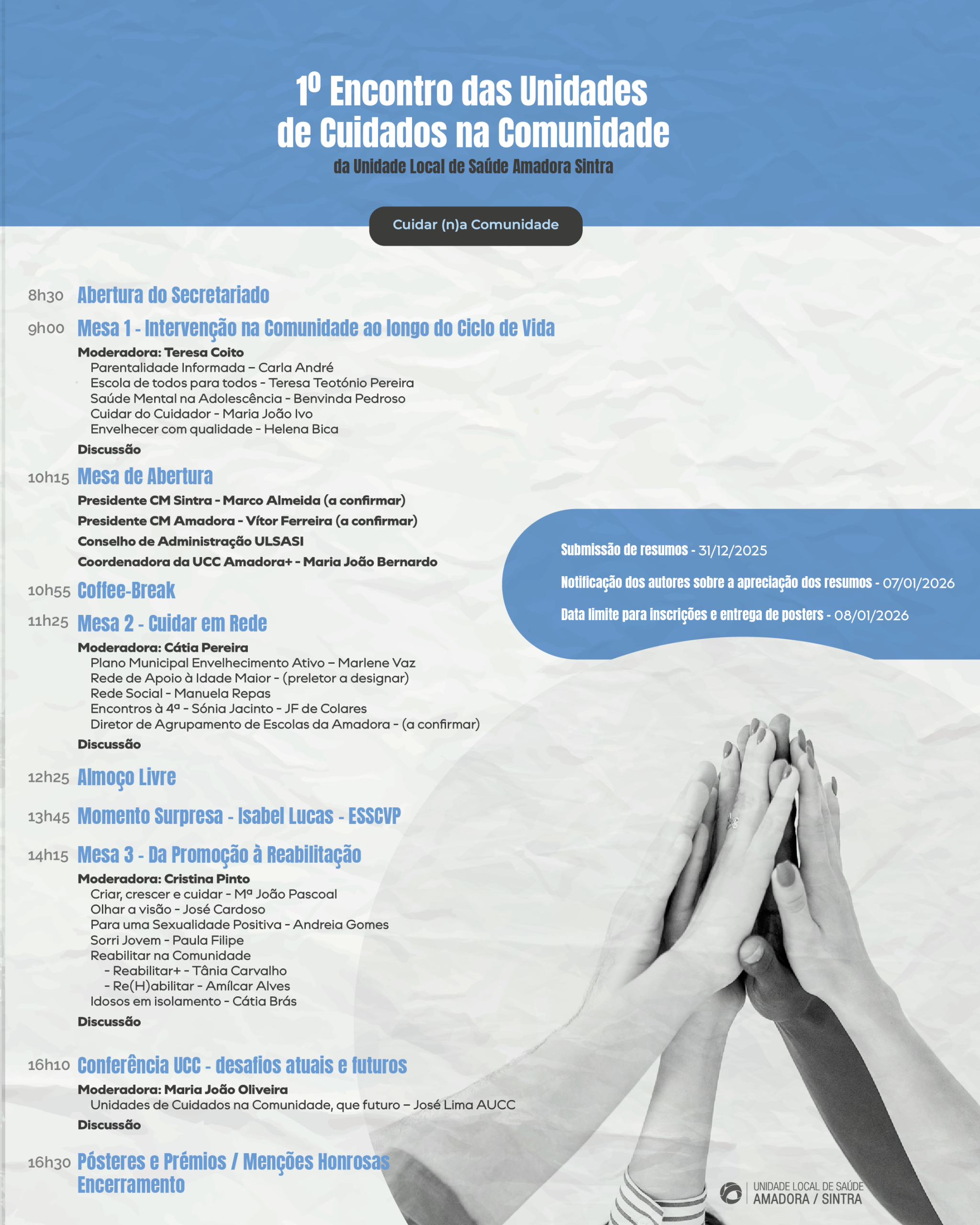 Este Encontro é uma oportunidade única para valorizar e partilhar experiências das UCC da ULS Amadora/Sintra, destacando o seu papel estratégico na promoção da saúde, prevenção da doença, reabilitação e continuidade de cuidados.