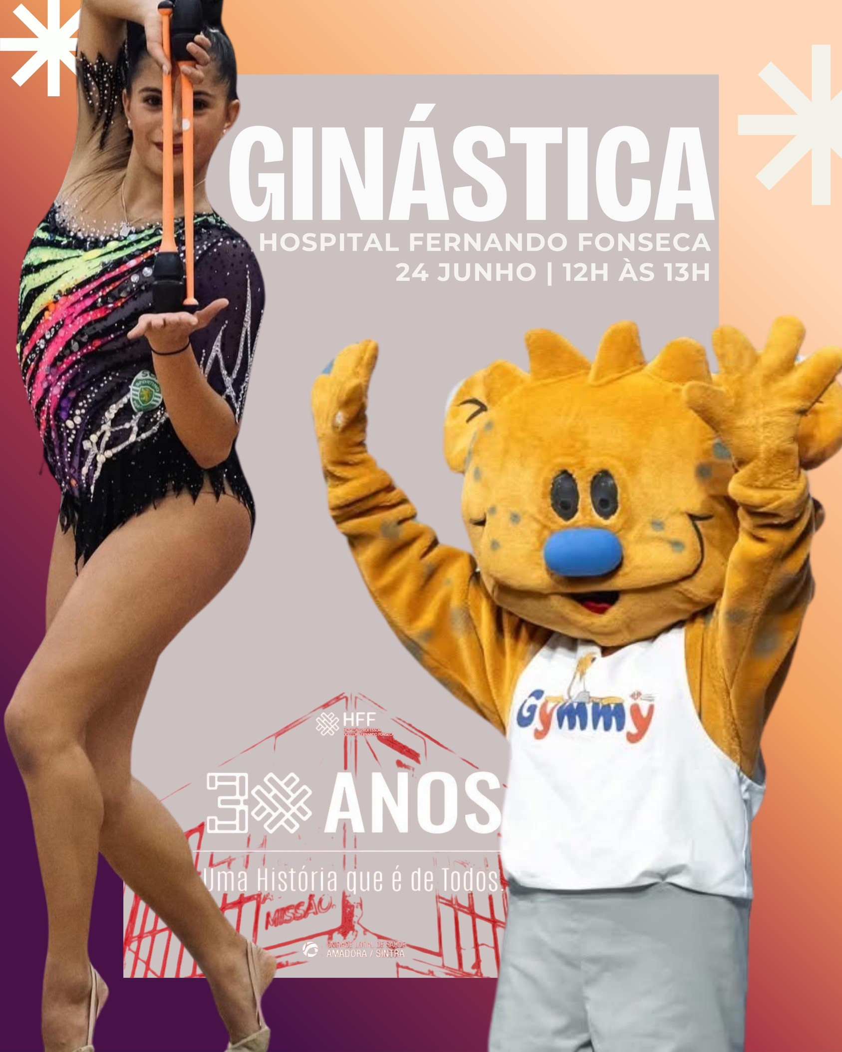 A Federação de Ginástica de Portugal junta-se ao Hospital Professor Doutor Fernando Fonseca nas comemorações do 30° Aniversário. Esta terça-feira, dia 24, às 12 horas, convidamo-lo a assistir a uma demonstração de ginástica para na qual todos, utentes e profissionais, podem participar.