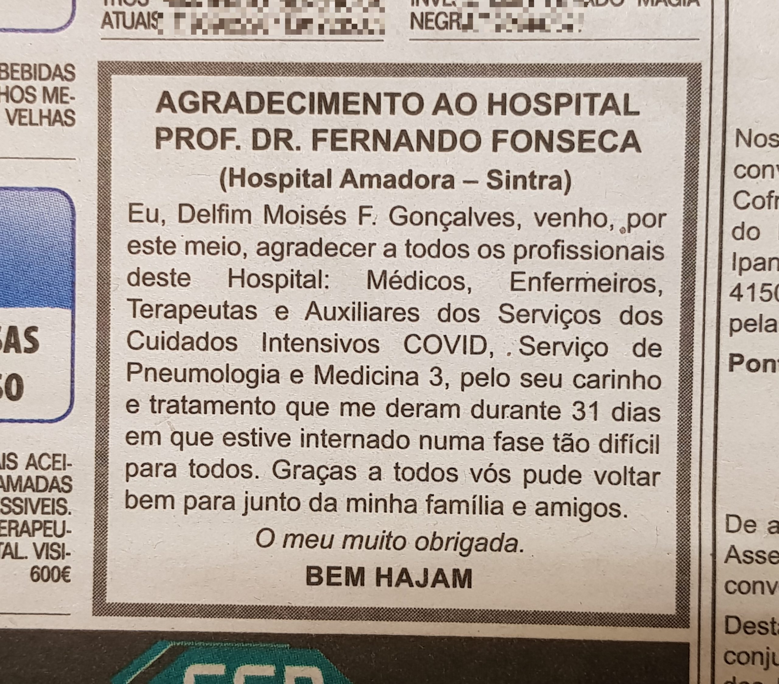 É tão bom abrir o jornal e encontrar este agradecimento dirigido aos profissionais do Hospital Professor Doutor Fernando Fonseca (HFF). O senhor Delfim Gonçalves encontrou uma forma diferente e original de agradecer a dedicação dos profissionais do HFF, depois de ter estado internado 31 dias, devido à COVID-19. Decidiu publicar um anúncio no jornal e assim fazer um público reconhecimento pelos cuidados que lhe foram prestados.