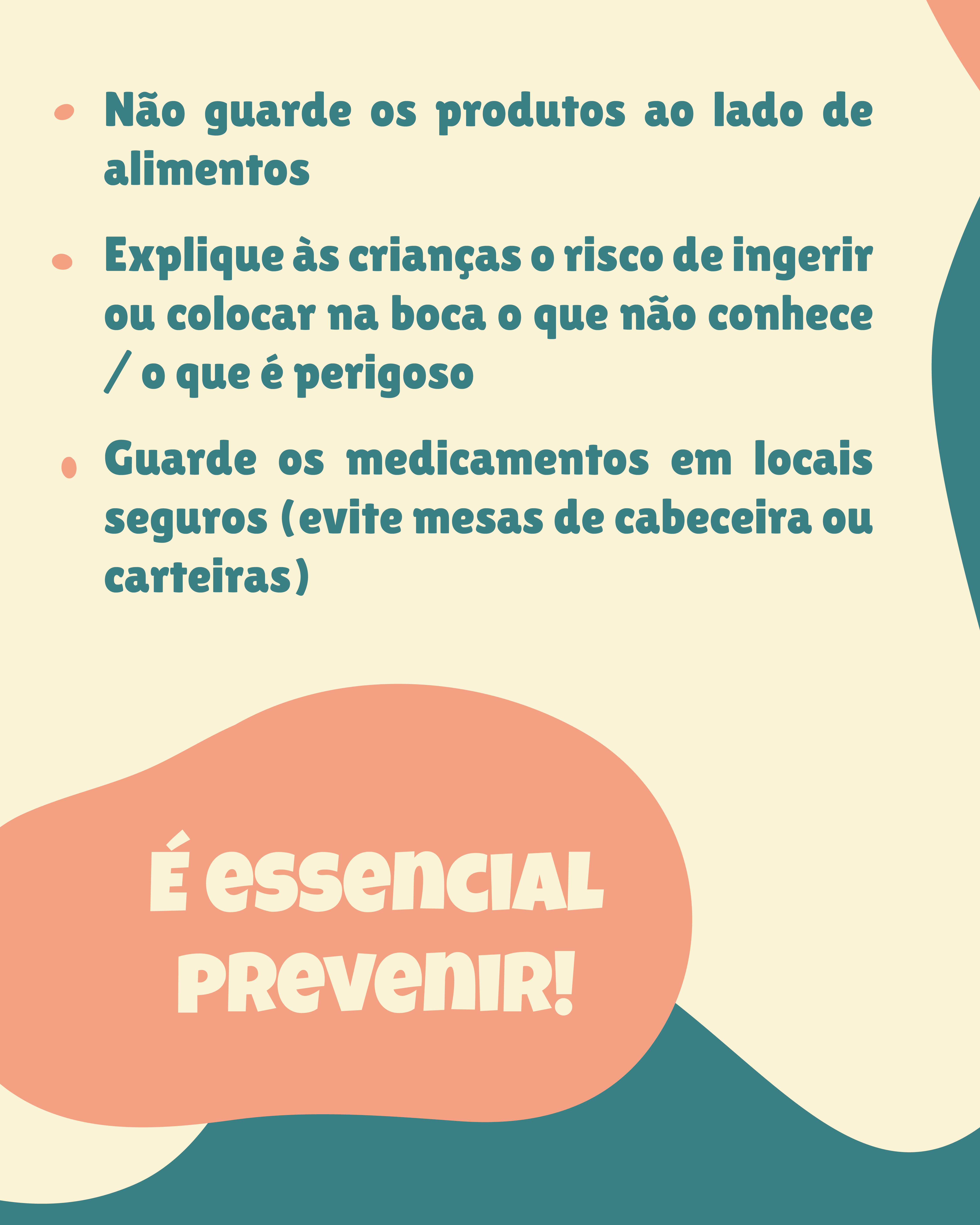 O melhor é prevenir a ingestão destes produtos pelos mais pequenos! Mantenha os produtos fora do alcance das crianças, sempre nas embalagens originais e guarde-os assim que não precisar deles.