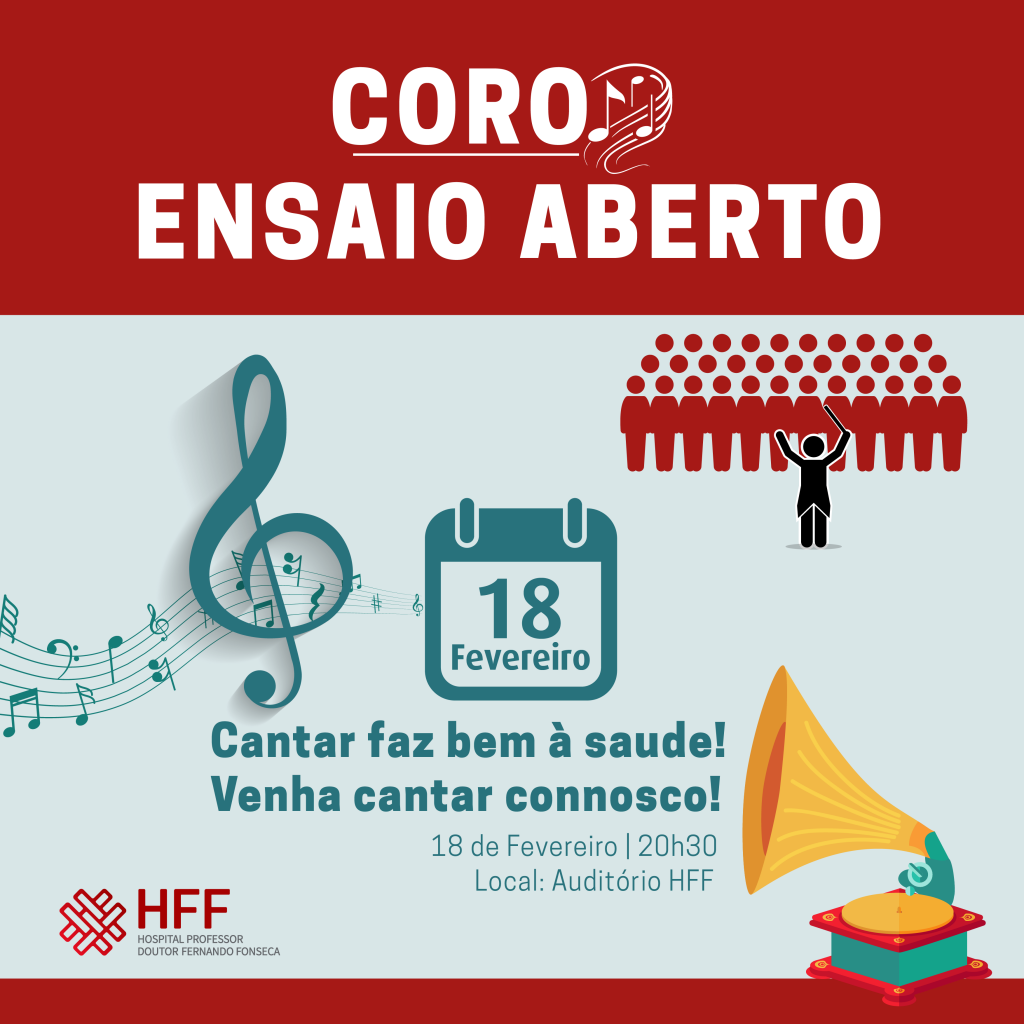 Porque cantar pode promover a sua saúde, reduzindo o envelhecimento cerebral e promovendo boa memória, ajudando as pessoas com asma ou problemas respiratórios, contribuindo para uma frequência cardíaca menor, entre outros benefícios, o Coro do Hospital Professor Doutor Fernando Fonseca (HFF) vai organizar um ensaio presencial, aberto a toda a comunidade, no próximo dia 18 de fevereiro, no auditório do HFF, pelas 20h30m.