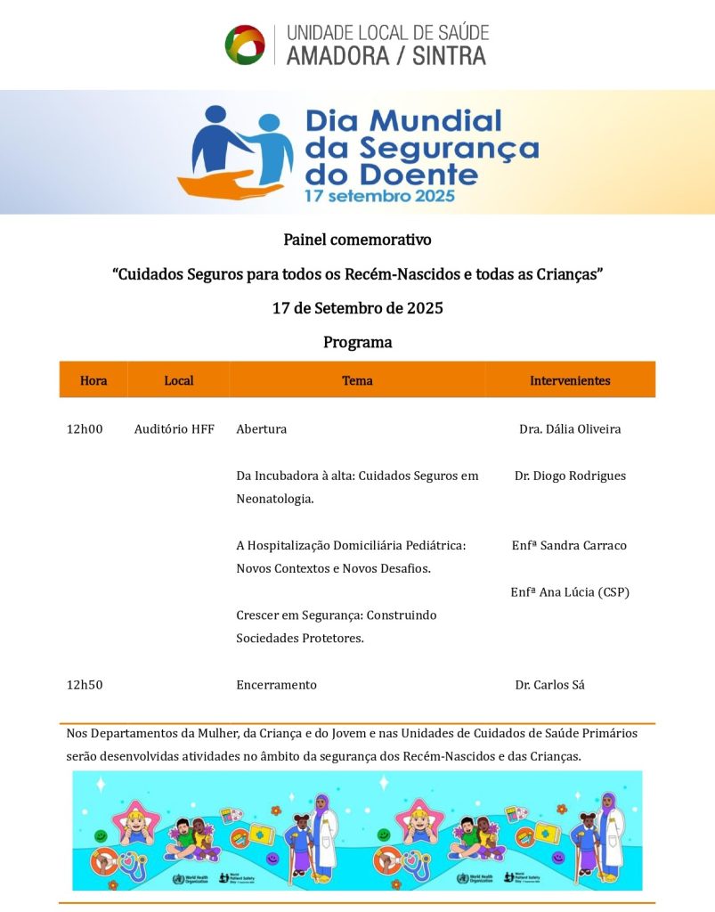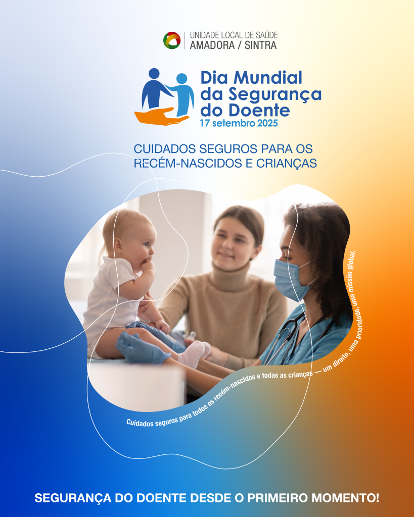 A Unidade Local de Saúde Amadora/Sintra associa-se à Organização Mundial de Saúde nas comemorações do Dia Mundial da Segurança do Doente 2025, este ano com o tema “Cuidados seguros para os recém-nascidos e crianças” e o slogan “Segurança do Doente desde o primeiro momento!“, sublinhando a importância de garantir cuidados de saúde seguros desde o nascimento e ao longo da vida.