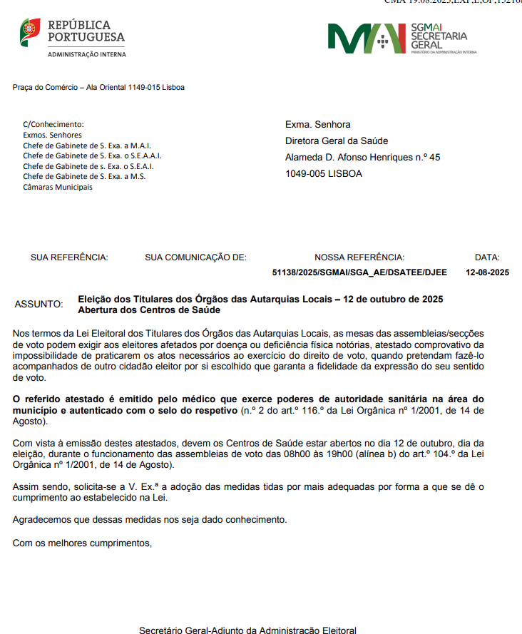 Os utentes que, por força de incapacidade física, estejam impossibilitados de exercer por si só o direito de voto no Ato Eleitoral para as Eleições Autarquicas de 12 de Outubro, e que careçam de votar acompanhado(a) de outro eleitor por si escolhido, podem solicitar o Atestado emitido pela Autoridade de Saúde, poderão fazê-lo nos seguintes locais: