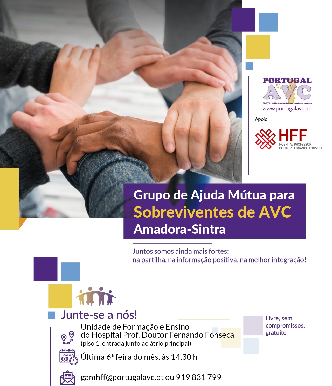 O GAM Amadora-Sintra reúne doentes sobreviventes de AVC, os seus familiares e/ou cuidadores na última 6ª feira de cada mês, pelas 14h30, no espaço físico do HFF. Esta sexta-feira será no Ginásio Verde do Serviço de Medicina Física e de Reabilitação do HFF.