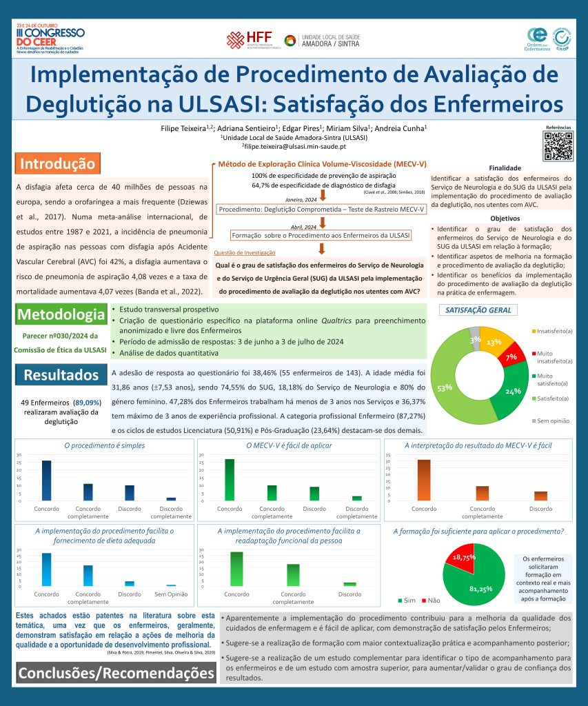 Filipe Teixeira, Enfermeiro Especialista em Enfermagem de Reabilitação (EEER), do Serviço de Urgência Geral e membro do grupo de trabalho de Deglutição Comprometida do Hospital Professor Doutor Fernando Fonseca (HFF), foi distinguido com a apresentação do Poster intitulado “Implementação de Procedimento de Avaliação de Deglutição na ULS Amadora/Sintra: Satisfação dos Enfermeiros”.