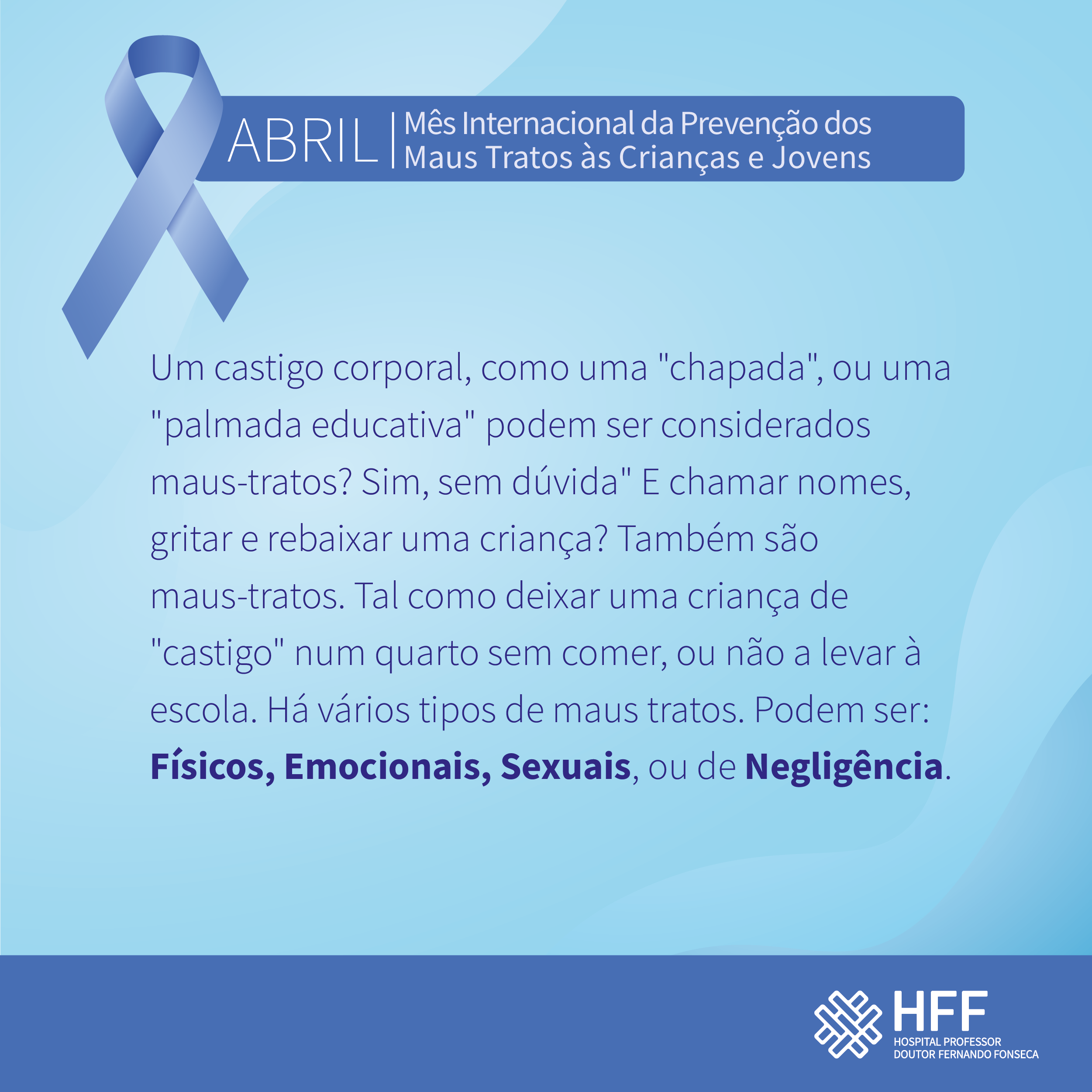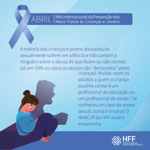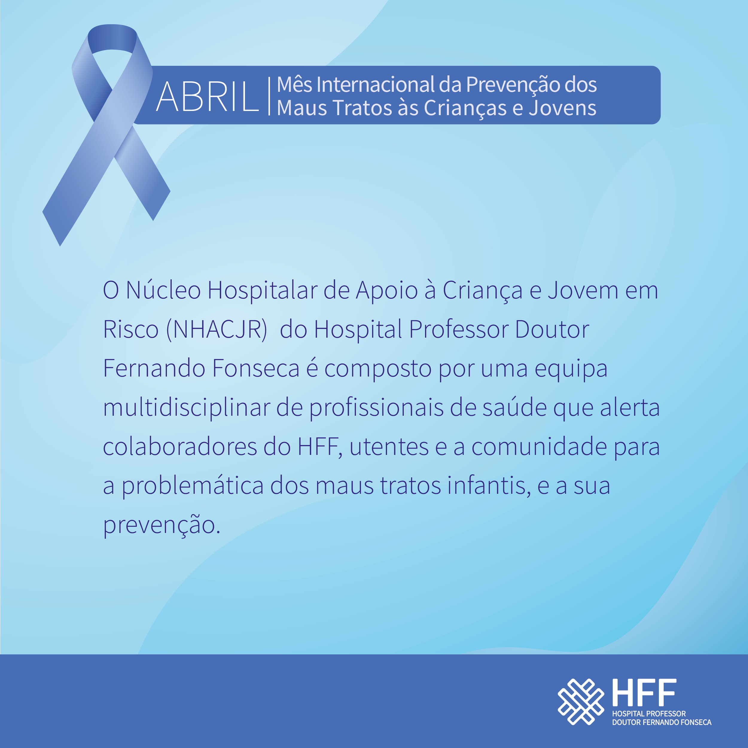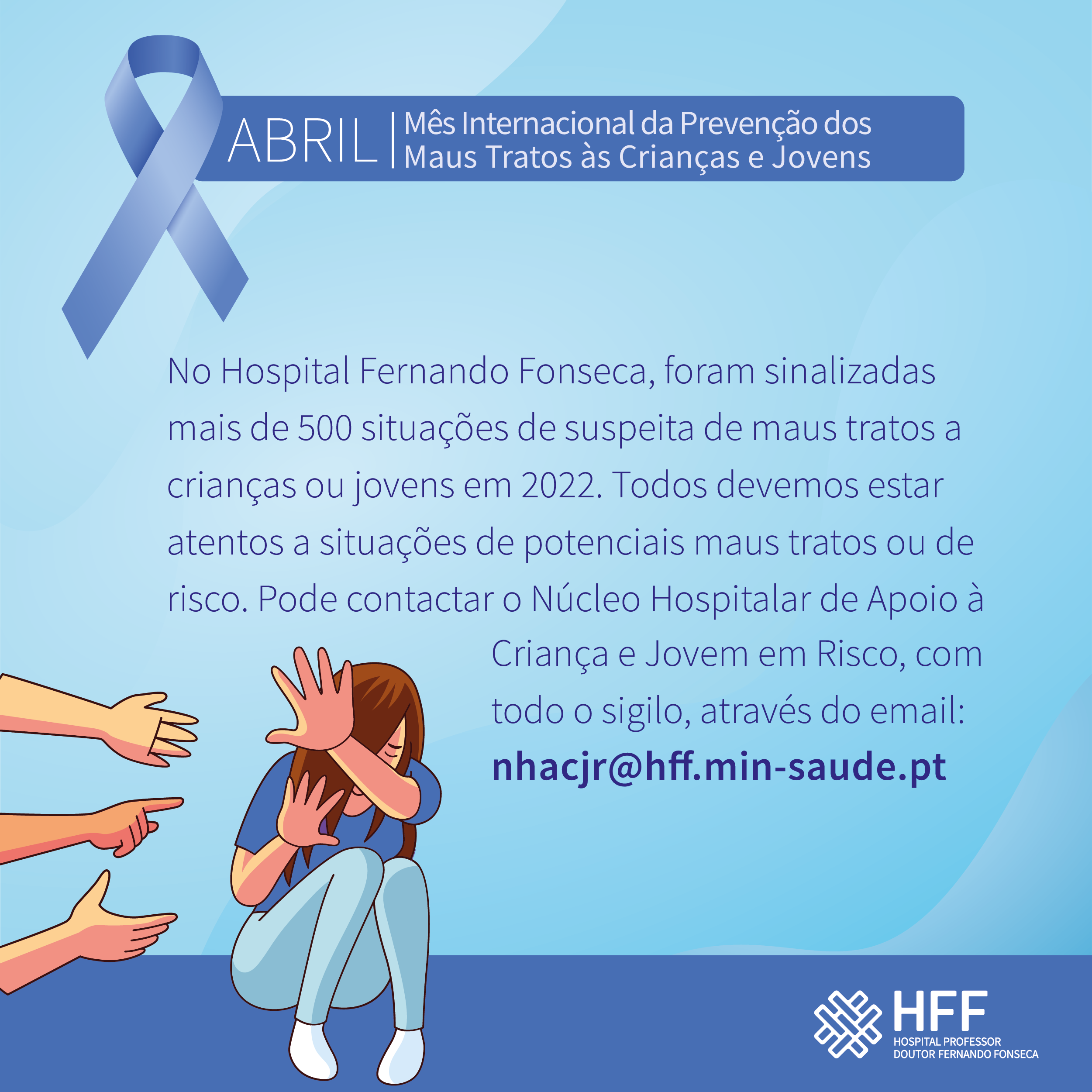 Ao longo do mês de abril temos estado a divulgar nas redes sociais do Hospital Professor Doutor Fernando Fonseca (HFF) vários alertas informativos direcionados a utentes, profissionais e comunidade sobre a problemática dos maus-tratos a crianças e jovens, a que todos deveremos estar atentos/as.