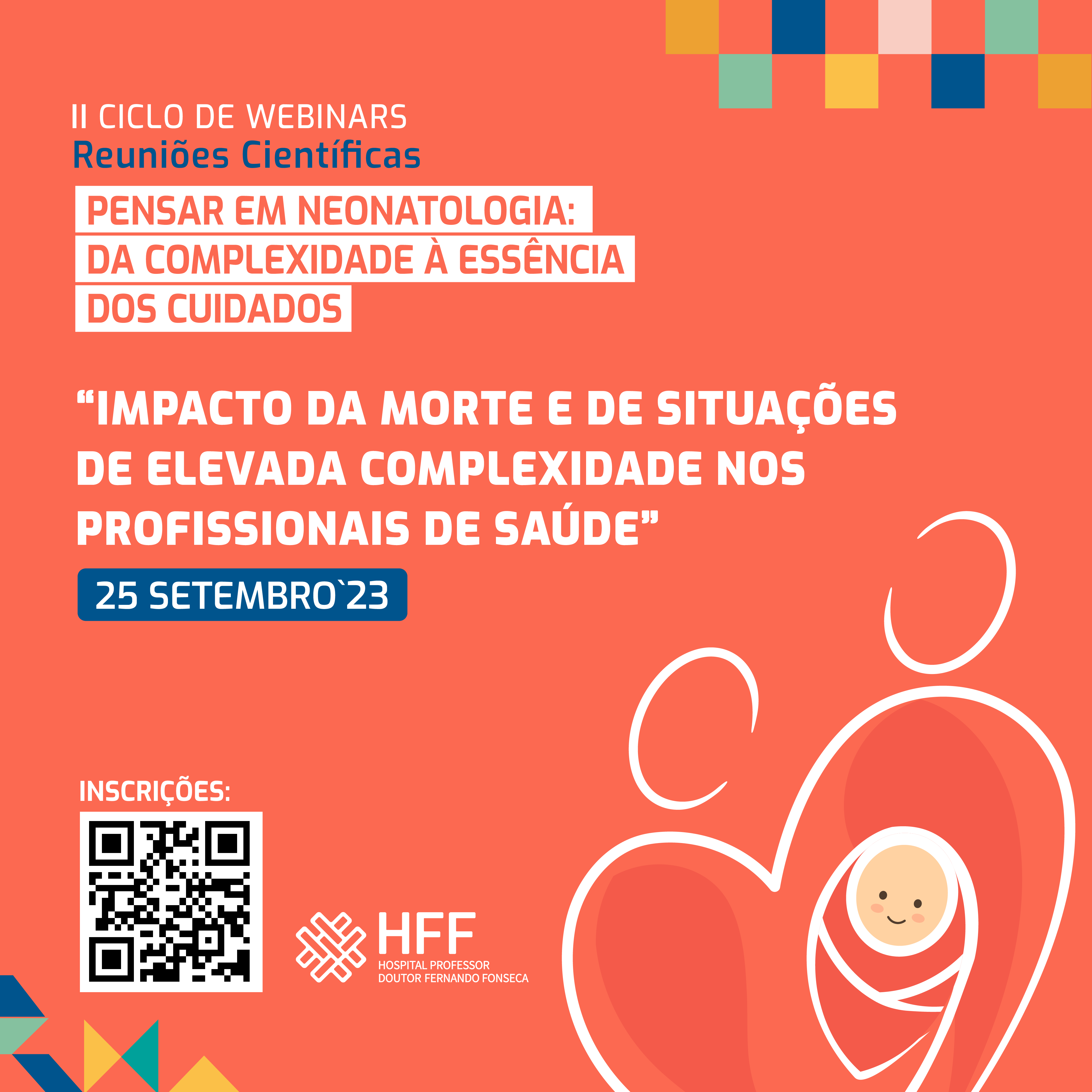 A Comissão Organizadora do II Ciclo de Reuniões Científicas “Pensar em Neonatologia: da complexidade à essência dos cuidados”, do Serviço de Neonatologia do Hospital Professor Doutor Fernando Fonseca (HFF) tem a satisfação de divulgar que no próximo dia 25 de setembro de 2023, das 17h00 às 19h00, irá decorrer o 5º webinar com o tema “Impacto da morte e de situações de elevada complexidade nos profissionais de saúde”.