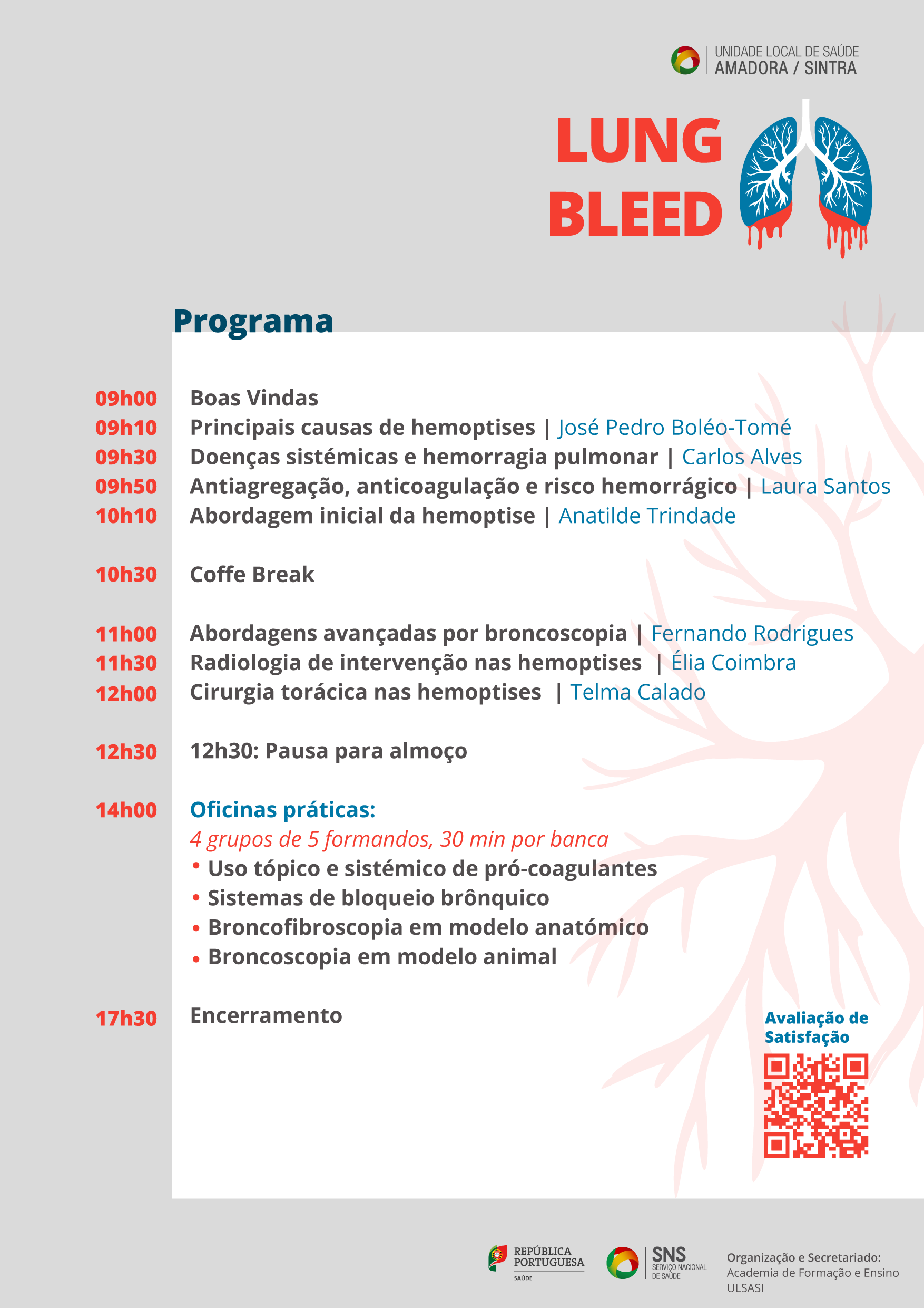 Da responsabilidade do Serviço de Pneumologia do Hospital Fernando Fonseca, este workshop visa reforçar competências teóricas e práticas, promovendo a partilha de conhecimento entre especialistas e contribuindo para a melhoria contínua da resposta clínica na abordagem do doente com hemoptise.