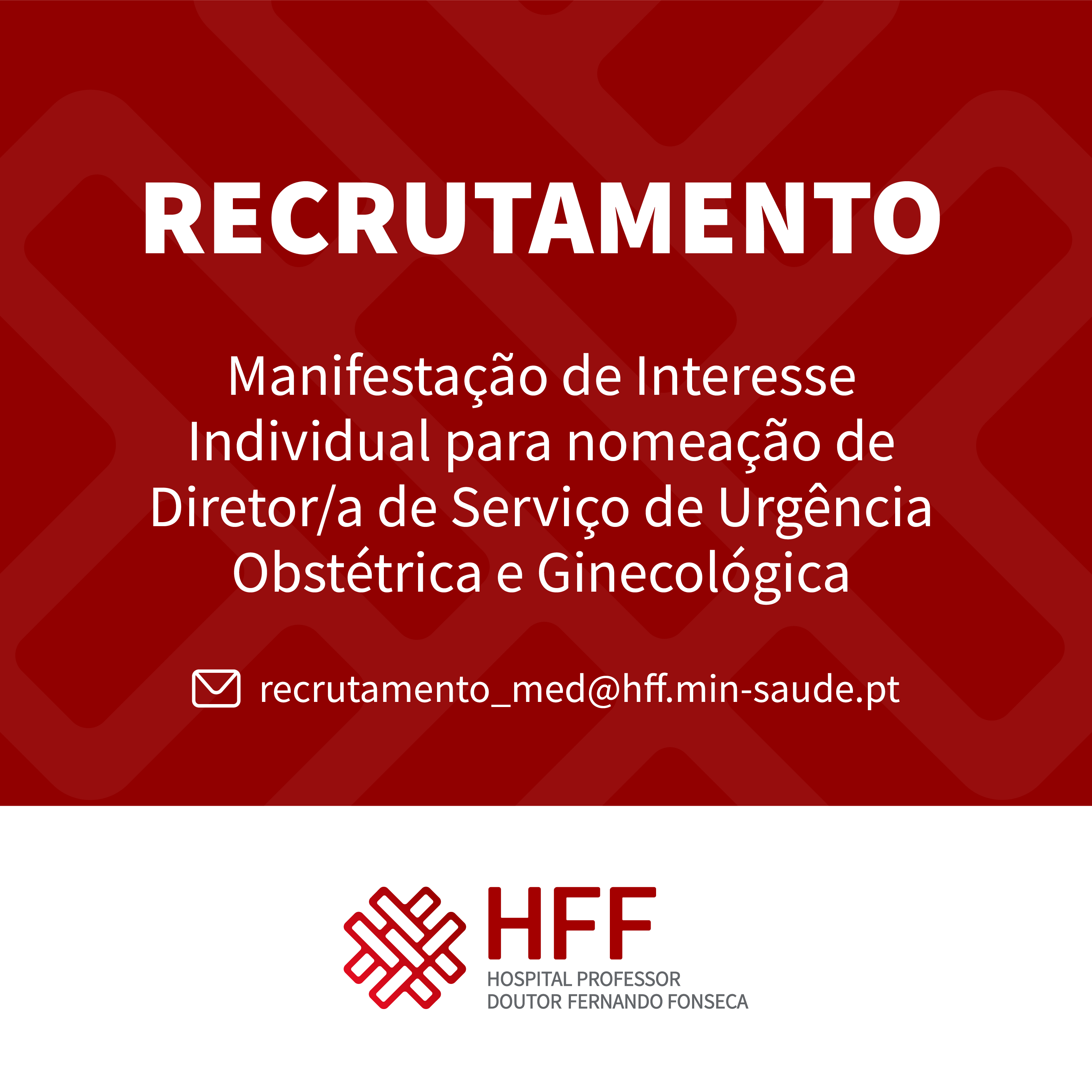 Nos termos do artigo 99.º do Decreto-Lei n.º 52/2022, de 4 de agosto e dos artigos 46º do Regulamento Interno do HFF, EPE, faz-se público que se encontra aberto entre 10/11/2023 e 23/11/2023, o processo de manifestação de interesse individual com vista à nomeação de Diretor/a de Serviço de Urgência Obstétrica e Ginecológica do Hospital Professor Doutor Fernando Fonseca (HFF).