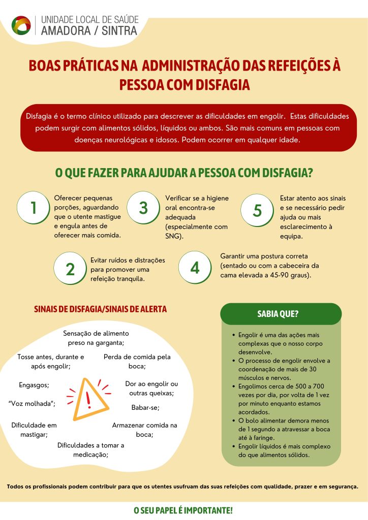 A disfagia — dificuldade em engolir alimentos sólidos, líquidos ou ambos — é, segundo o Grupo de Deglutição Segura do Hospital Fernando Fonseca, mais frequente em pessoas com doenças neurológicas e em idosos, embora possa ocorrer em qualquer idade. Para ajudar a identificar sinais de risco e promover boas práticas, os profissionais elaboraram um documento informativo dirigido a todos os que lidam com esta condição.