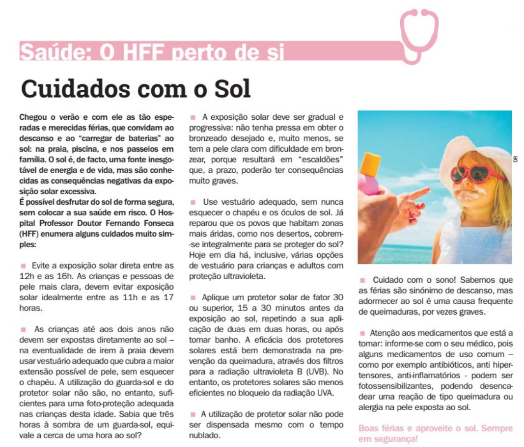O Hospital Professor Doutor Fernando Fonseca (HFF), em parceria com o jornal “Correio de Sintra“, dá-lhe várias dicas e conselhos de forma a desfrutar do sol de forma segura, sem colocar a sua saúde em risco. Esta parceria pretende aumentar a literacia da população nas questões relacionadas com a Saúde.