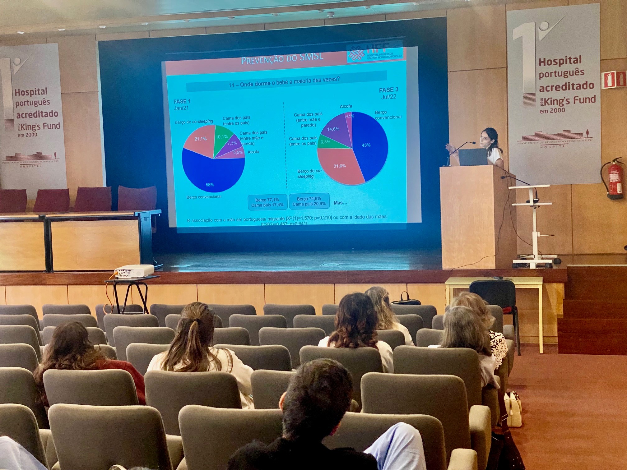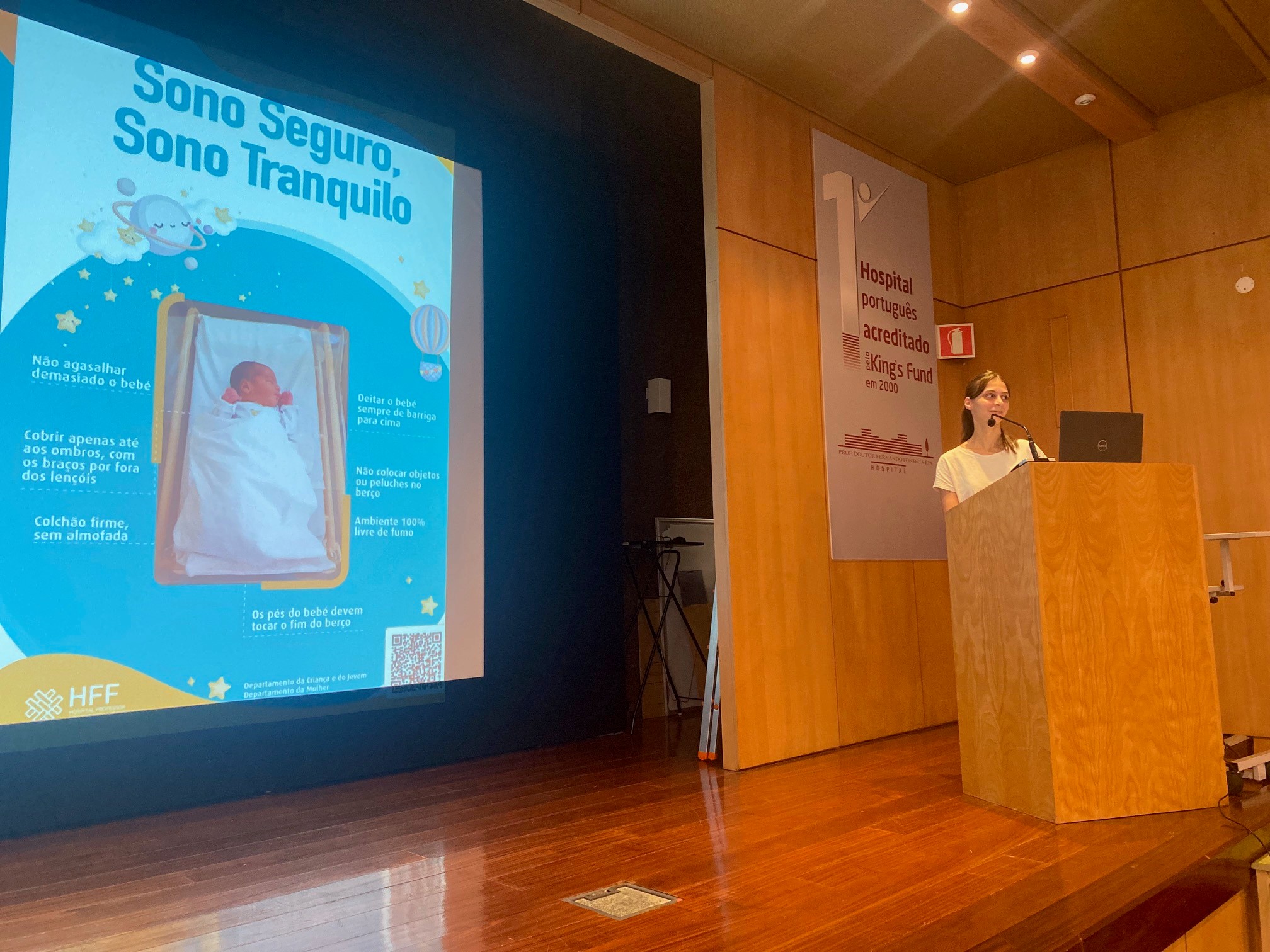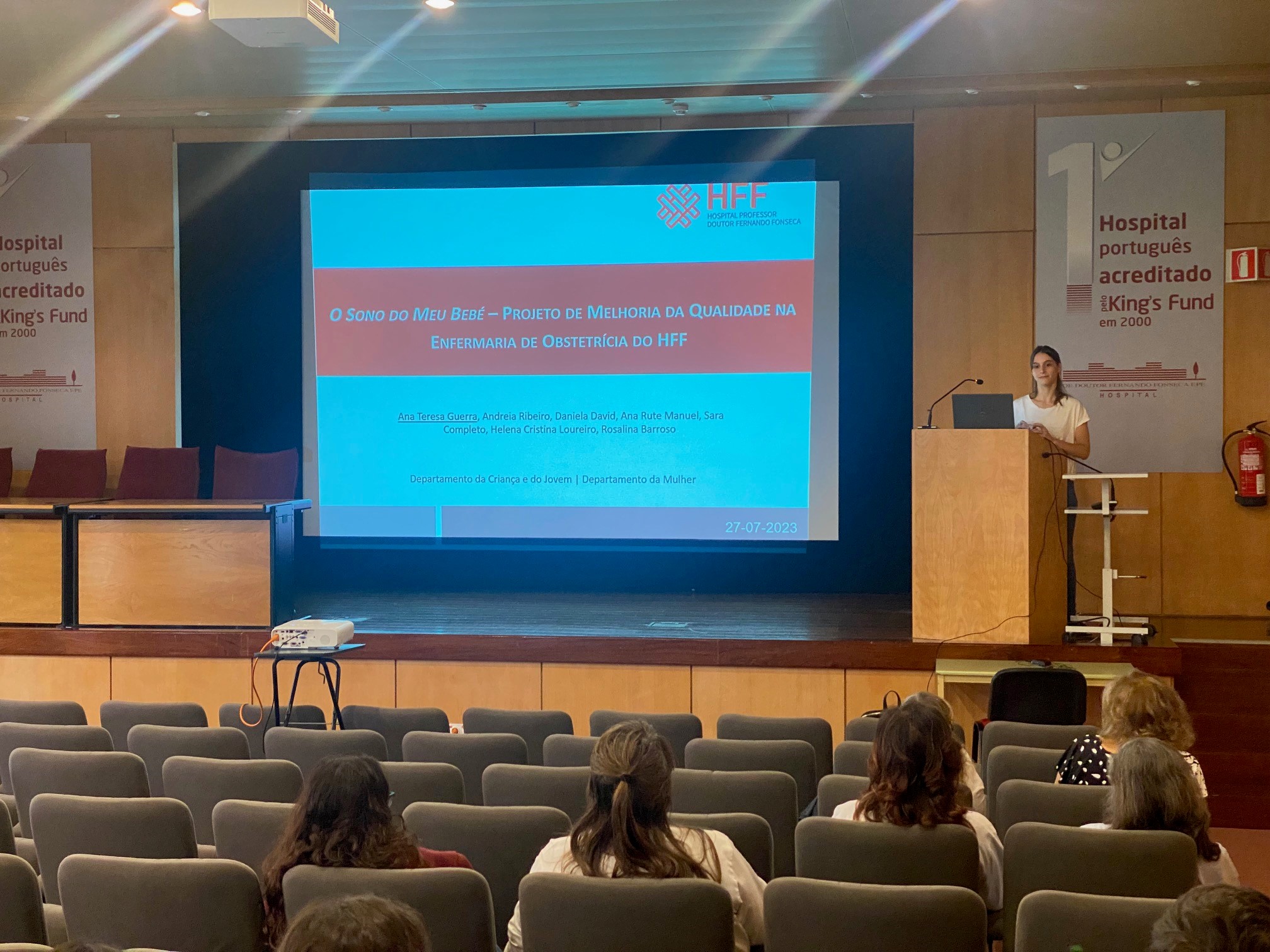 A mais recente Sessão Clínica do Hospital Professor Doutor Fernando Fonseca (HFF) teve como tema “O sono do meu bebé – projeto de melhoria de qualidade na enfermaria de obstetrícia do HFF” e esteve a cargo da médica interna de pediatria Ana Teresa Guerra.