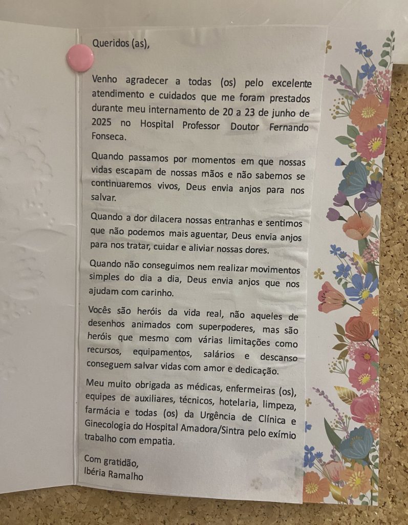 Por trás de cada utente, há esforço, renúncia e amor. E por isso, mais do que nunca, é essencial reconhecer esse trabalho com respeito, gratidão e palavras de carinho. Um simples elogio pode renovar forças, relembrar o propósito e fazer com que esses profissionais sigam adiante com ainda mais motivação. Valorizá-los é também cuidar de quem cuida de nós. É com esse intuito que vos envio estes agradecimentos. Para vos renovar e fortalecer!