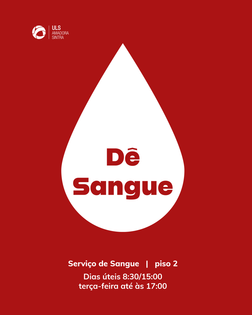 O Serviço de Sangue e Medicina Transfusional da Unidade Local de Saúde Amadora/Sintra (ULS Amadora/Sintra) está à espera da sua dádiva, todos os dias úteis, entre as 08h30 e as 15h00. Às terças-feiras até às 17h00.
