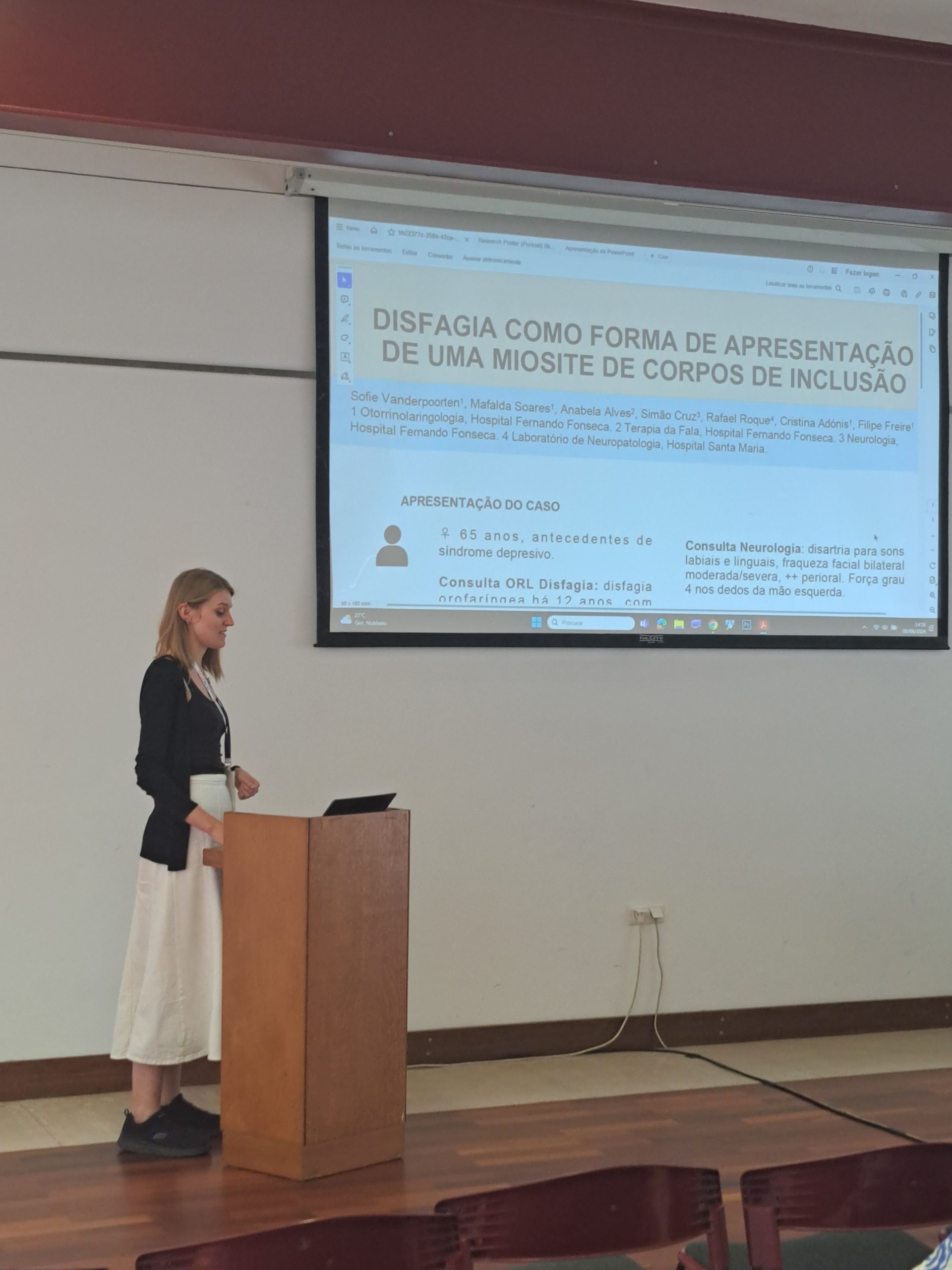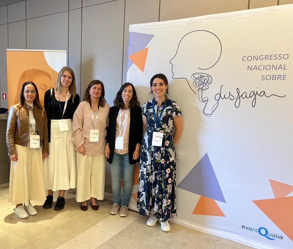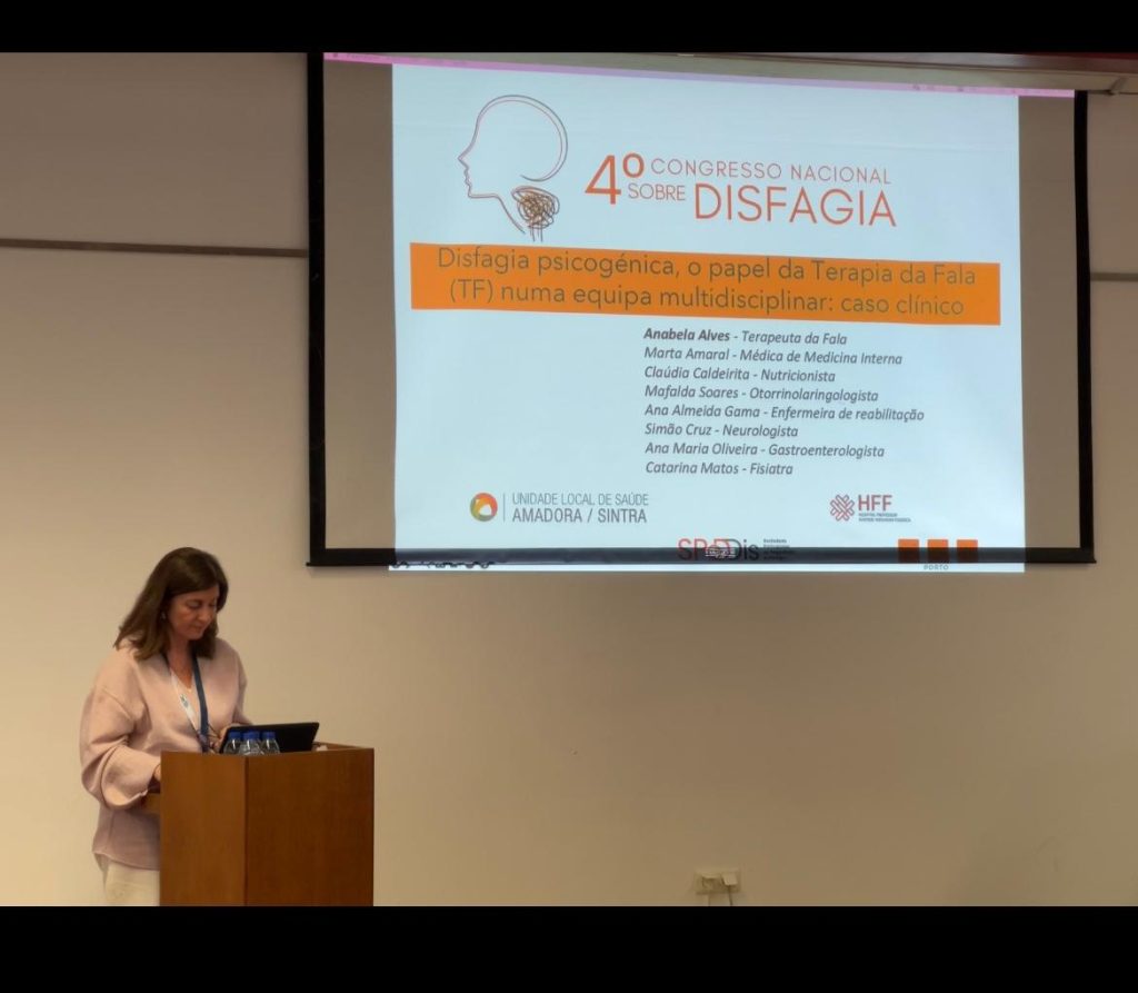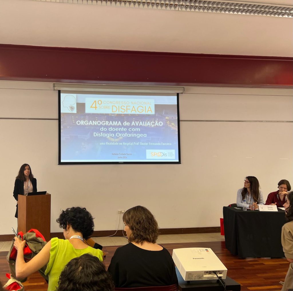 Participaram respetivamente a Dra. Mafalda Soares (Serviço Otorrinolaringologia) com a comunicação oral “Organograma de avaliação do doente com disfagia orofaríngea: uma realidade no Hospital Prof. Doutor Fernando Fonseca”; a TSDT Anabela Alves (Serviço MFR área de Terapia da Fala) com a comunicação oral “Disfagia psicogénica, o papel da Terapia da Fala numa equipa multidisciplinar: caso clínico” e a Dra. Sofie Vanderpoorten (Serviço Otorrinolaringologia) com o poster “Disfagia como forma de apresentação de uma Miosite de Corpos de Inclusão”.