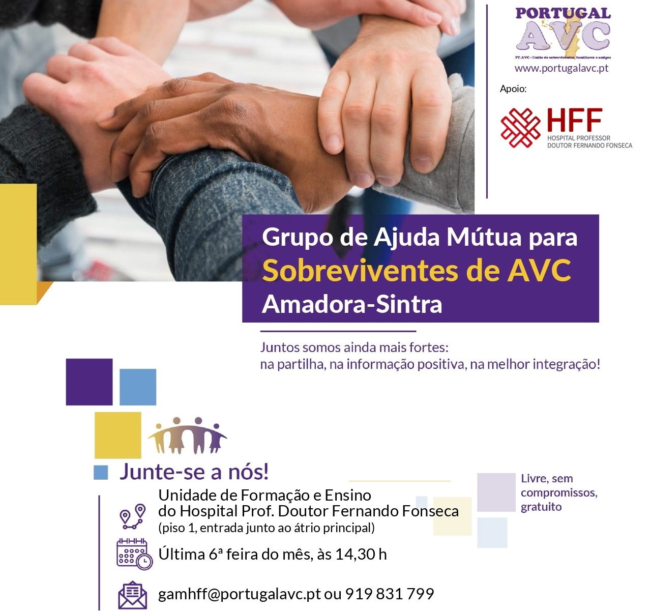 O GAM Amadora-Sintra reúne doentes sobreviventes de AVC, os seus familiares e/ou cuidadores na última 6ª feira de cada mês, pelas 14h30, no espaço físico do HFF, na Unidade de Formação e Ensino (no piso 1, junto ao átrio principal do hospital).