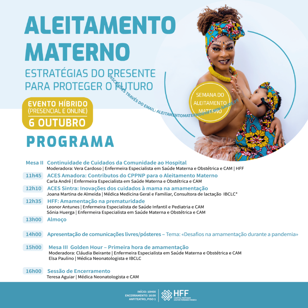 Nesta Semana Nacional do Aleitamento Materno, que se assinala de 3 a 7 de outubro, este ano com o mote “Estratégias do Presente para Proteger o Futuro”, o Hospital Professor Doutor Fernando Fonseca (HFF) vai realizar atividades abertas à população em geral, com o objetivo de consciencializar para a importância do aleitamento materno e para os seus inúmeros benefícios. Consulte o programa na imagem.
