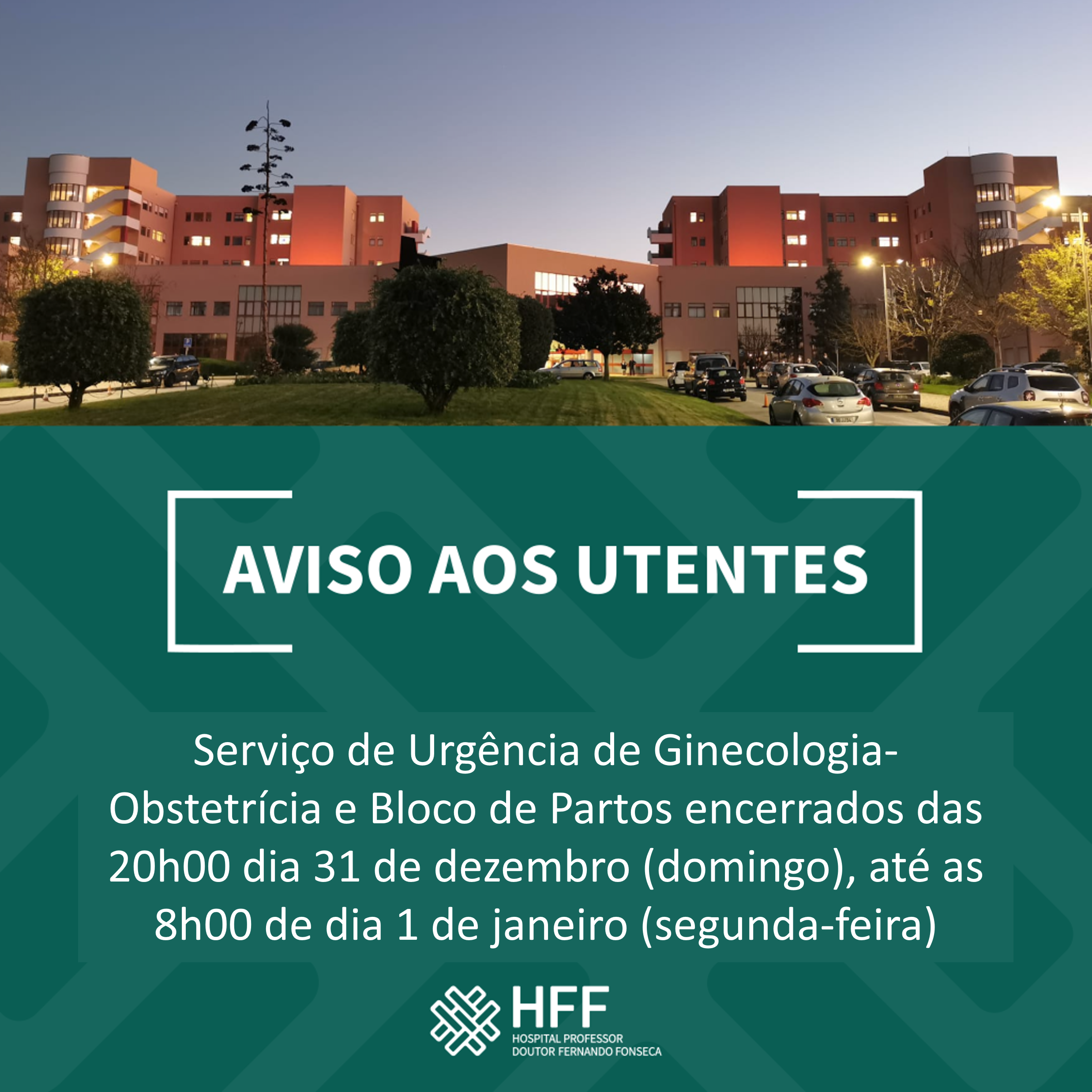 O Hospital Professor Doutor Fernando Fonseca (HFF) informa que o Serviço de Urgência de Ginecologia-Obstetrícia e Bloco de Partos estarão encerrados das 20h00 dia 31 de dezembro (domingo), até as 8h00 de dia 1 de janeiro (segunda-feira).