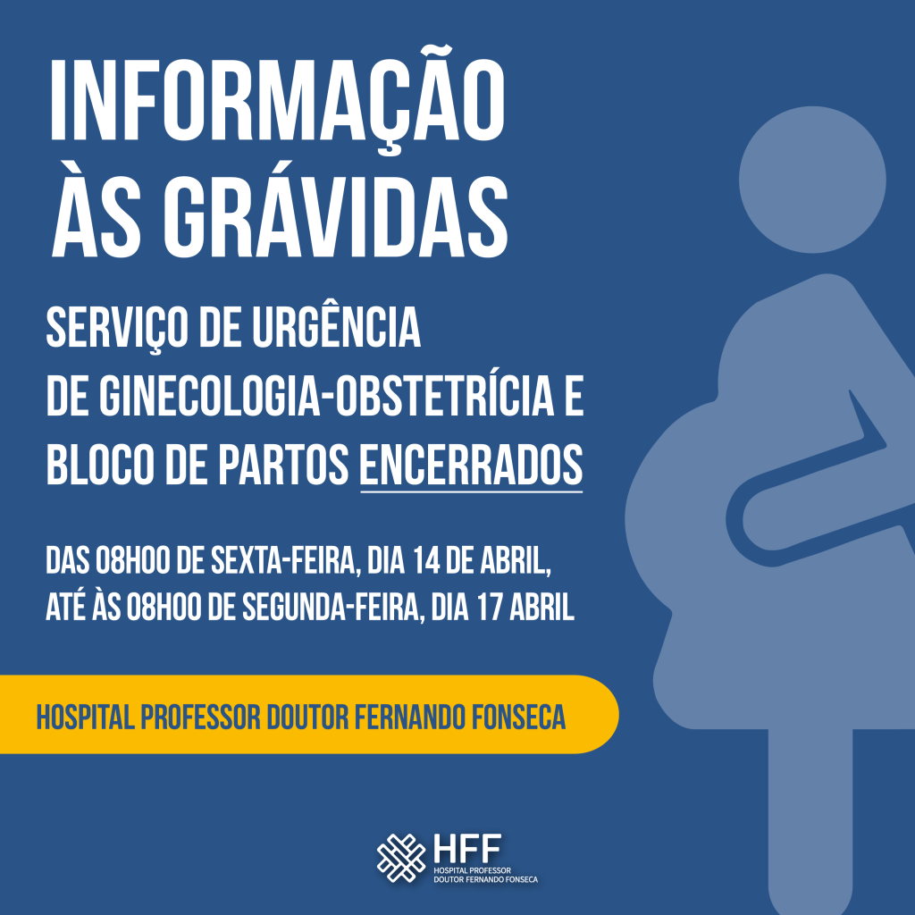 O Hospital Professor Doutor Fernando Fonseca (HFF) informa que o seu Serviço de Urgência de Ginecologia-Obstetrícia e o Bloco de Partos vão estar encerrados entre as 8h00 desta sexta-feira, dia 14 de abril, e as 8h00 de segunda-feira, dia 17 de abril, por deliberação da Direção Executiva do Serviço Nacional de Saúde (DE-SNS).
