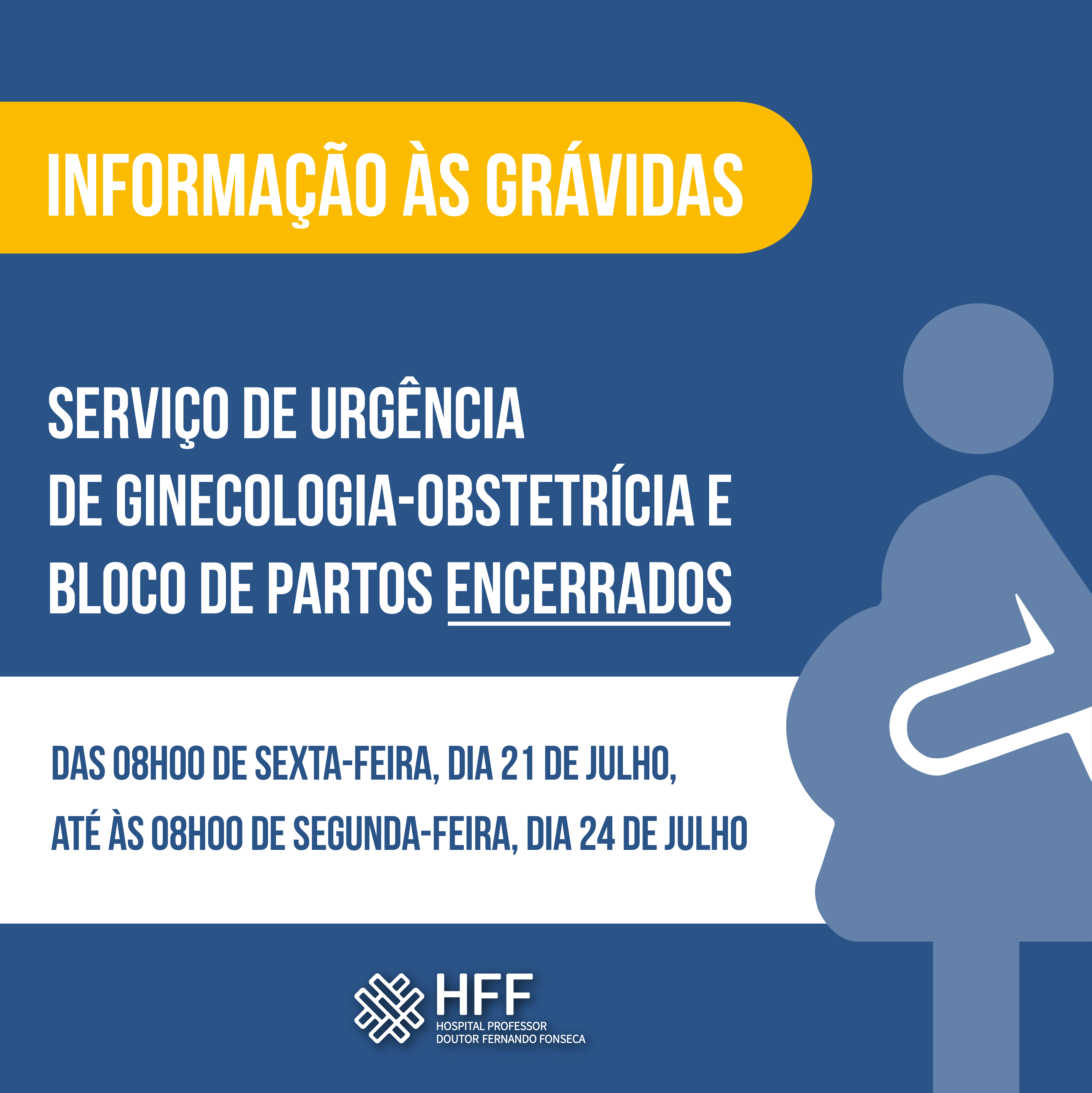 O Hospital Professor Doutor Fernando Fonseca (HFF) informa que o seu Serviço de Urgência de Ginecologia-Obstetrícia e o Bloco de Partos vão estar encerrados entre as 8h00 desta sexta-feira, dia 21 de julho, e as 8h00 de segunda-feira, dia 24 de julho, por deliberação da Direção Executiva do Serviço Nacional de Saúde (DE-SNS).