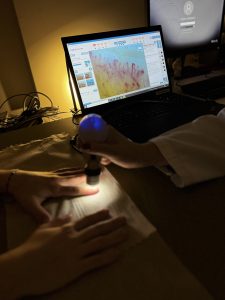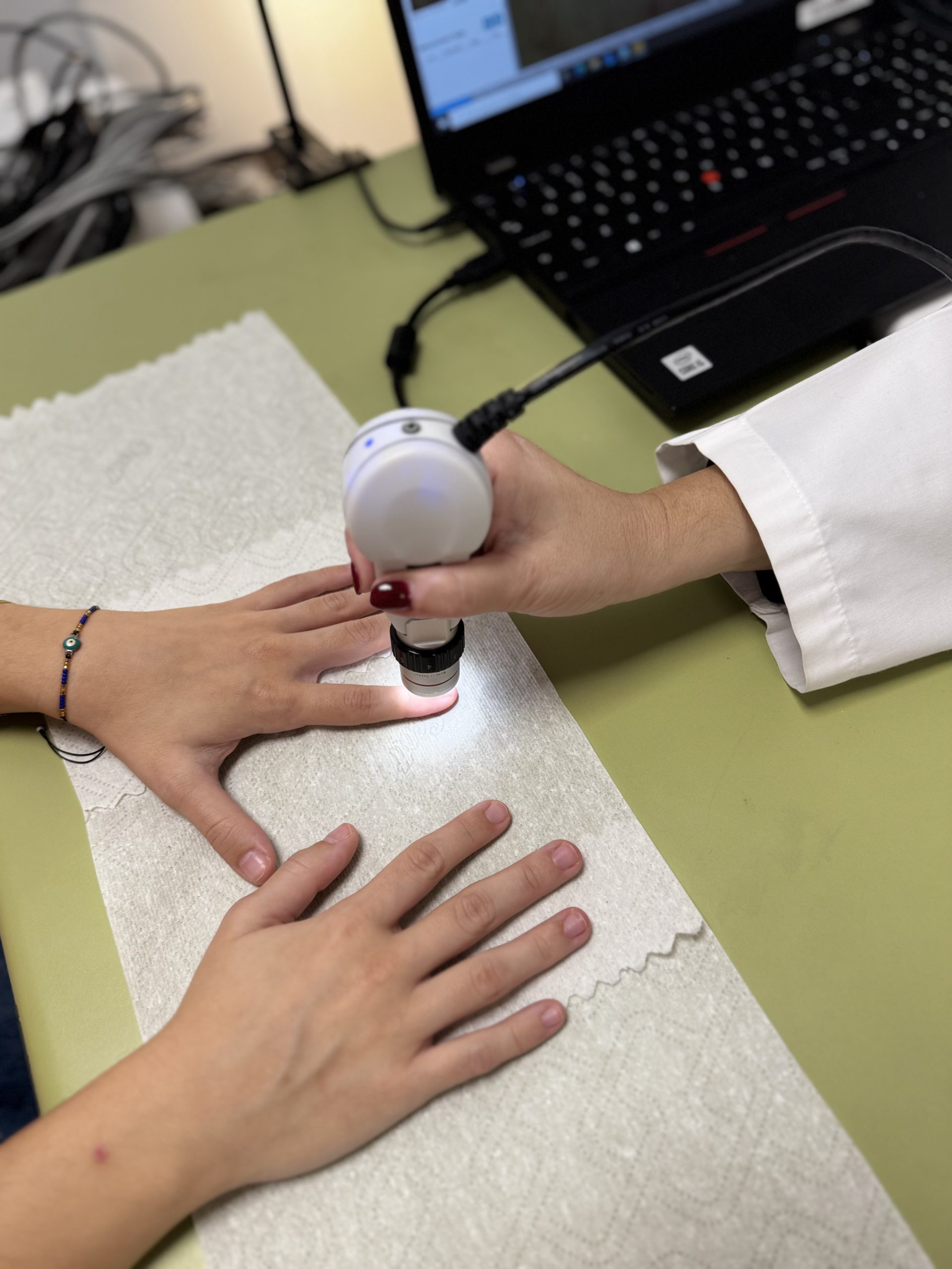 Este aparelho permite a realização da Capilaroscopia peri-ungueal, um exame que possibilita a visualização da rede capilar dérmica, através de um sistema de ampliação e luz, e que assenta na particular visibilidade da microcirculação no leito ungueal da mão.