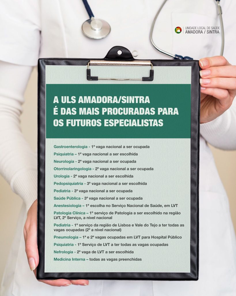 Destacamos os Serviços da ULS Amadora/Sintra que mais se evidenciaram a nível nacional, bem como nas escolhas das vagas na Região de Lisboa e Vale do Tejo (LVT).