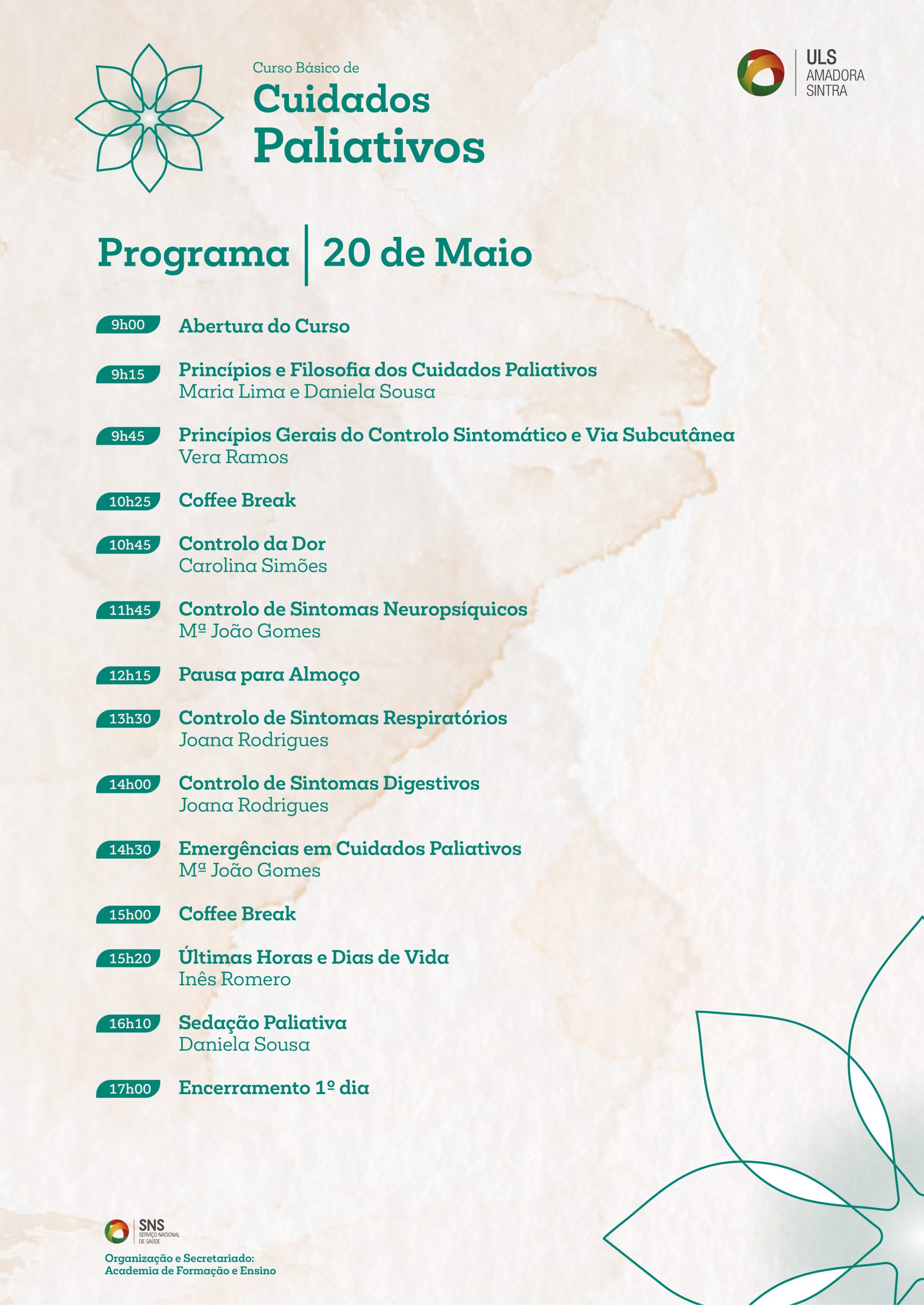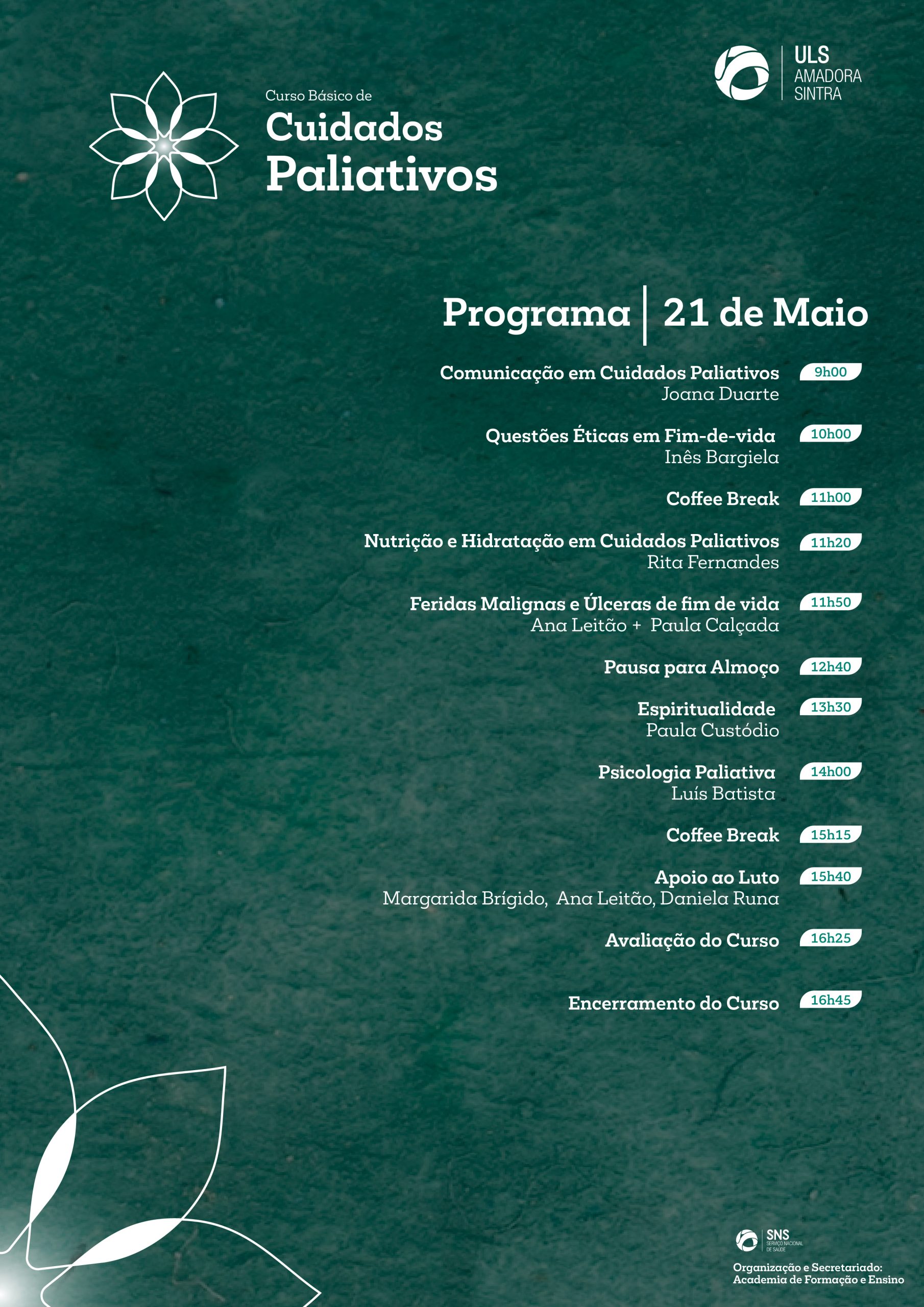 A ULS Amadora/Sintra promove, nos dias 20 e 21 de maio, no Hospital de Sintra, um Curso Básico de Cuidados Paliativos, dirigido a profissionais que enfrentam diariamente situações de envelhecimento e agravamento de doenças crónicas na população.