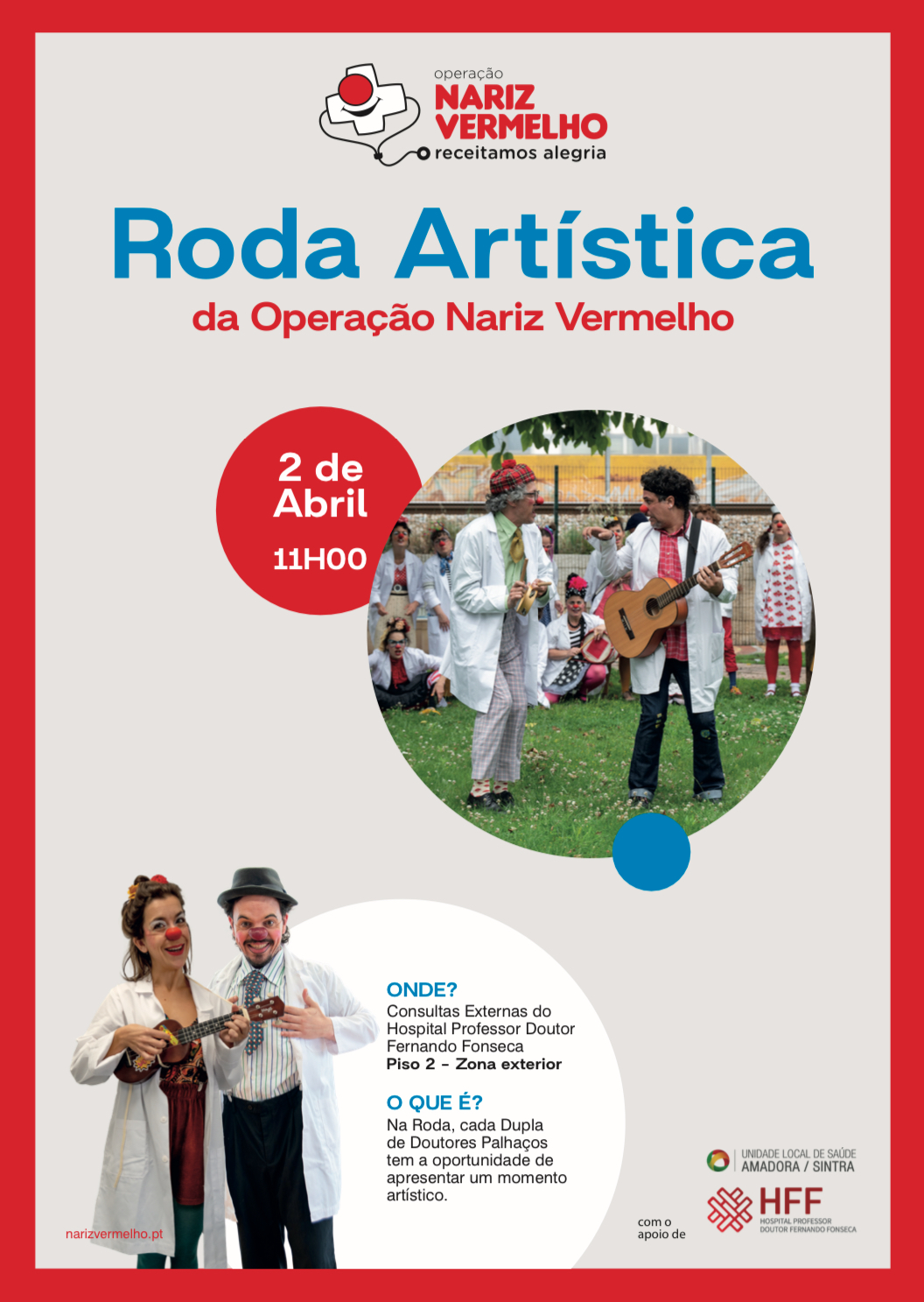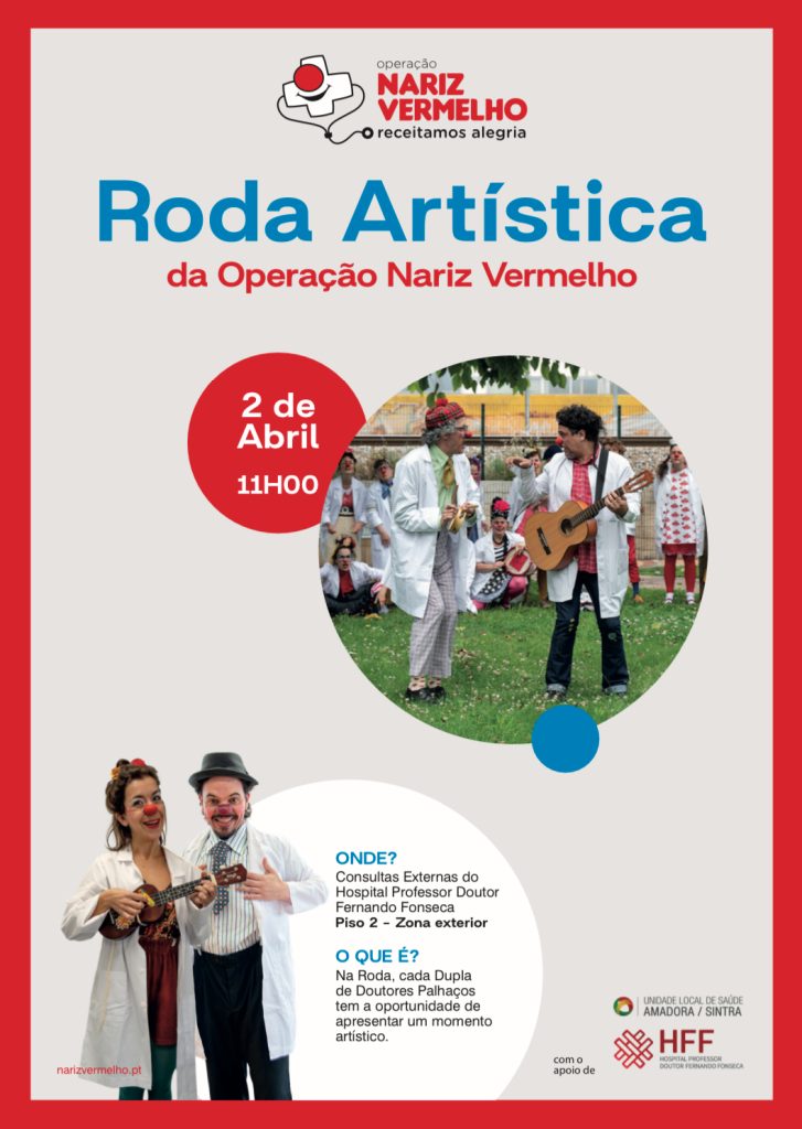 A Unidade Local de Saúde Amadora/Sintra vai receber pela primeira vez, no próximo dia 2 de abril, quarta feira, no Hospital Professor Doutor Fernando Fonseca (HFF) , a performance: «Roda Artística» que vai ser protagonizada pela equipa artística da Operação Nariz Vermelho (ONV). A iniciativa vai ter lugar na área exterior do Serviço de Consultas Externas do HFF, no Piso 2, e promete ser um momento único dedicado às crianças, famílias, acompanhantes, utentes e profissionais.