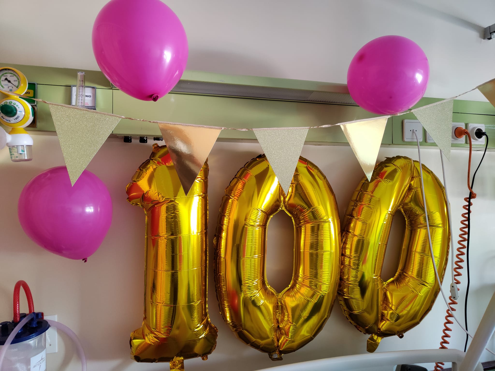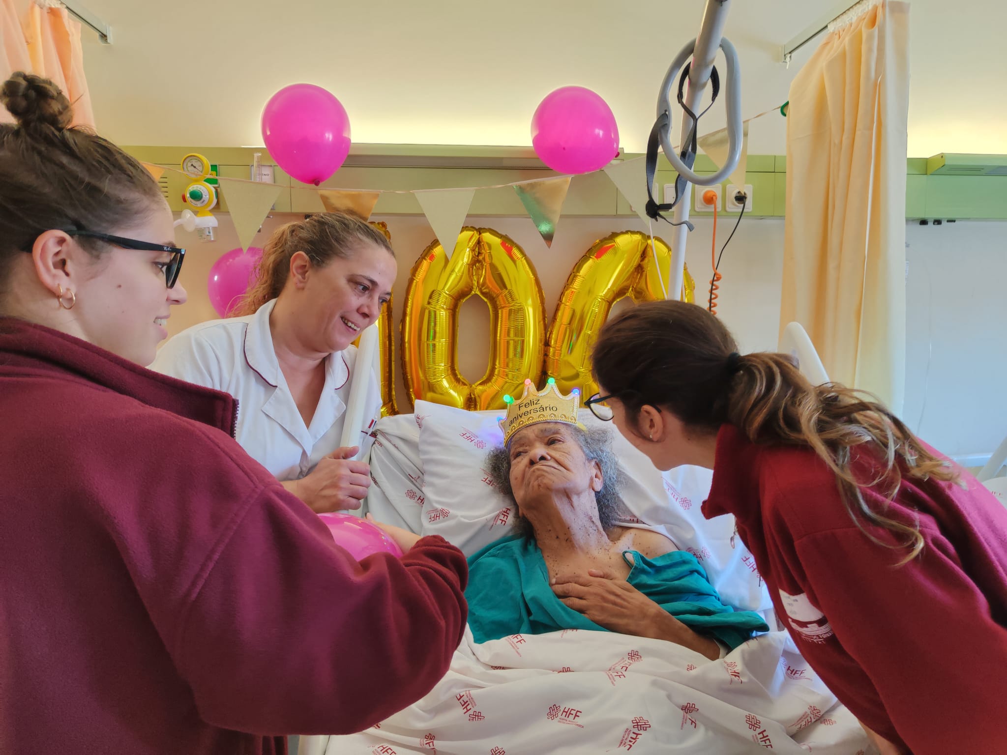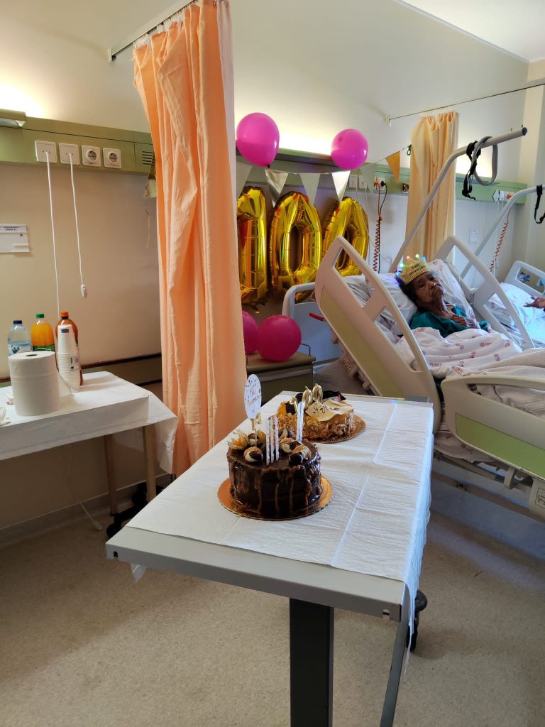 Hoje, a Medicina IV transformou-se num palco de alegria e emoção, graças aos corações bondosos dos/das profissionais de saúde que aqui trabalham. As enfermeiras e auxiliares, radiantes com esta incrível comemoração, encheram o quarto de balões, criando uma atmosfera de festa e celebração.