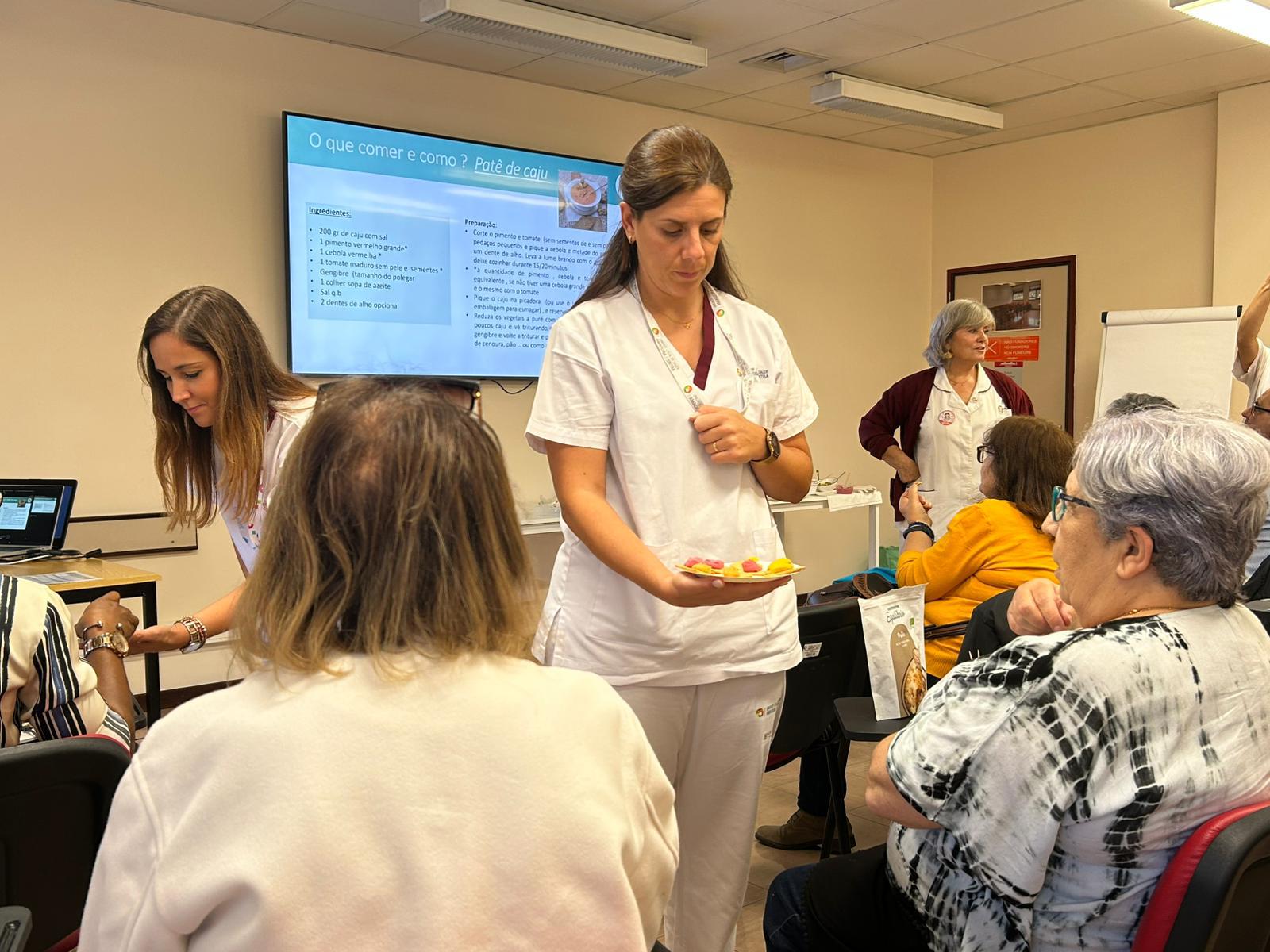 A sessão decorreu no espaço de Formação da unidade hospitalar, com o objetivo de sensibilizar a comunidade e os profissionais de saúde para o papel crucial que a alimentação desempenha na qualidade de vida, adaptação e bem-estar de quem vive com uma ostomia.